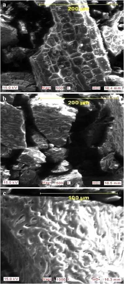 掃描電子顯微鏡通過用聚焦的電子束掃描來產(chǎn)生樣品的圖像。甲酸和乙酸吸附前后制備的活性炭的SEM圖如圖2所示 。 圖2a顯示吸附前活性炭的形態(tài)。碳表明活性炭的表面性質(zhì)是高度多孔的,并且會(huì)增強(qiáng)甲酸和乙酸的吸附。碳呈現(xiàn)不規(guī)則的網(wǎng)狀結(jié)構(gòu),這意味著由粗糙表面積組成的完整的三維多孔內(nèi)部結(jié)構(gòu)的形成。熱解過程中焦炭的孔隙發(fā)育也很重要,因?yàn)檫@將通過促進(jìn)活化劑(HNO 3)分子擴(kuò)散到孔中從而增加活性炭的表面積和孔體積,從而增加HNO 3碳相互作用,在活性炭表面產(chǎn)生更多的孔。活性炭表面上這些孔的發(fā)育可能是導(dǎo)致水溶液中乙酸和加速那吸收量高的主要因素。很明顯在圖2 B,C的吸附前活性炭的表面上的大的孔碳的表面上吸附的吸附后均減少。這意味著甲酸和乙酸被吸附到制備的活性炭的表面上。