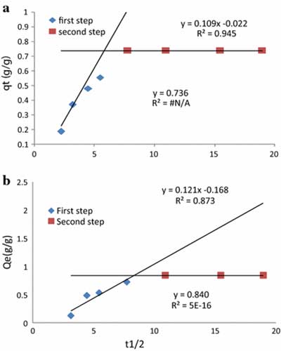 吸附機(jī)理粒子內(nèi)擴(kuò)散模型用于確定總體吸附速率是否通過顆粒內(nèi)擴(kuò)散來控制,即吸附物質(zhì)分子進(jìn)入活性炭孔隙內(nèi)部。q t對(duì)t 1/2的曲線圖給出如圖3所示的線性關(guān)系 。截面(C)的值和斜率的粒子內(nèi)擴(kuò)散速率常數(shù)(Kid)的計(jì)算值總結(jié)在表中。較大的截距值表明,與表面擴(kuò)散相比,顆粒內(nèi)擴(kuò)散具有較小的作用。該圖顯示在吸附過程中發(fā)生兩個(gè)步驟。急劇上升的部分是外表面吸附階段,而第二直線部分是逐漸吸附階段,其中顆粒內(nèi)或孔擴(kuò)散是速率限制。急劇上升部分的高R 2值表明外表面吸附是速率限制步驟。線偏離原點(diǎn)和低R 2逐漸吸附階段的值表明,顆粒內(nèi)擴(kuò)散不是唯一的限速步驟,因?yàn)樵缙趫?bào)道了類似的結(jié)果。這意味著外表面的吸附或瞬時(shí)吸附階段發(fā)生,并且可以被用來描述吸附過程的機(jī)構(gòu)。