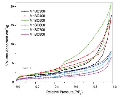 N 2吸附 - 解吸等溫線:為了研究MnCl 2活性炭的孔隙率,使用氮?dú)馕椒?一種測(cè)定多孔吸附劑孔隙率的標(biāo)準(zhǔn)程序)來測(cè)定其表面積和多孔結(jié)構(gòu)。圖1顯示了可逆的II型等溫線,其由無孔或大孔吸附劑獲得并表示無限制的單層 - 多層吸附。II型等溫線包含B點(diǎn),即等溫線的幾乎線性中間部分的開始,表明單層覆蓋的終止階段和多層吸附的開始。B點(diǎn)位于這條線上很遠(yuǎn)的地方,表明MnBC具有微小的微孔結(jié)構(gòu)。