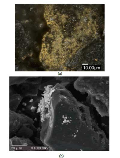 圖2:(a)放大2000倍的活性炭在其表面上沉積金屬Au的光學顯微照片的圖像。(b)具有沉積的金屬Au的活性炭的SEM圖像。
