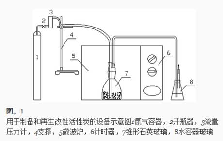 該實驗裝置是一種經改良的家用微波爐,其工作頻率為2,540MHz。改變微波爐以將氮引入錐形石英玻璃中。氮氣瓶與流量計連接(圖1)。錐形石英玻璃用作每個實驗的反應器。將制備的改性活性炭在室溫下在氮氣保護下冷卻,并從微波爐中取出,用于下一個實驗。