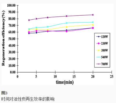 經過研究發現了活性炭再生的最佳條件。在700 W微波照射功率和3 min照射時間下,改性活性炭的再生效率可達98%左右。