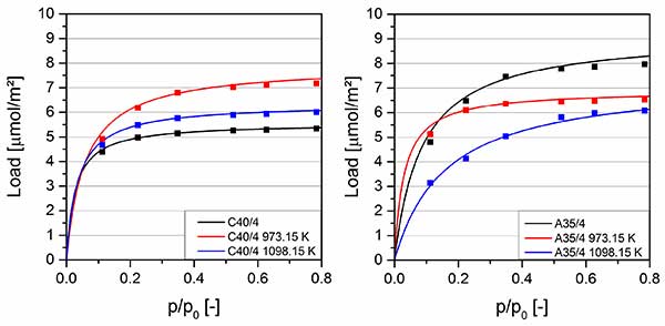圖2顯示極性溶劑丙酮在25攝氏度的吸附等溫線。未涂覆的活性炭A35/4與活性炭C40/4相比的負載顯著較高。兩種碳都是由相同的原料制造的,但活性炭A35/4在水蒸氣氣氛中經過較長時間的活化。由于原始生產過程中氧化條件下活化時間較長,活性炭A35/4具有較高的極性表面基團數(shù)量,有利于極性丙酮的吸附。在700攝氏度下涂覆的樣品的負載對于兩種類型的活性炭具有相同的數(shù)量級,因為由于內部孔系統(tǒng)的涂覆,表面特性的差異減小,并且表面化學的相關修改。2涂層和極性丙酮,極性活性炭A35/4上的負載僅略有變化。在820攝氏度下涂覆的樣品也具有可比較的負載。由于非極性SiC涂層和由此導致的較弱的相互作用,負載低于在700攝氏度下涂覆的樣品的負載。