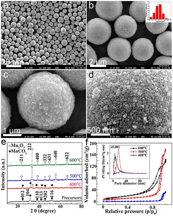 基于逐步自組裝生長的方法,可以首先在甘油中制備具有良好控制的尺寸和形態(tài)的單分散的MnCO 3前體微球體,然后將其轉(zhuǎn)化為分級的多孔Mn 2 O 3通過在400,500和600℃下退火8小時,大規(guī)模涂覆活性炭的微球體。我們可以通過簡單地使用甘油作為溶劑合成活性炭層來裝飾Mn基電極材料,然后在較高溫度下原位碳化生物質(zhì)。根據(jù)一系列的實(shí)驗(yàn)測試發(fā)現(xiàn)這些材料的高度增強(qiáng)的電化學(xué)性能可歸因于它們的表面的活性炭涂層。