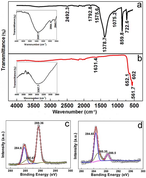 圖2. (a)前體和(b)活性炭氧化錳提的FTIR光譜。(c)前體和(d)活性炭氧化錳提的X射線光電子能譜(XPS)C1s譜。(a,b)中的插圖分別突出了來自2800-4000cm -1的前體和最終產(chǎn)物的FTIR光譜,其中縱軸放大。