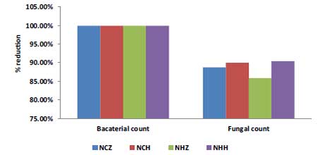 處理的廢水樣品的細(xì)菌和真菌分析結(jié)果如圖1所示。細(xì)菌和真菌計(jì)數(shù)的NIS限值為0CFU / 100mL,而細(xì)菌排放的允許限度并且廢水中的真菌數(shù)量是10,000CFU / 100mL。原污水的細(xì)菌和真菌數(shù)量分別為4,270和2,400 CFU / 100 mL,極高。細(xì)菌載量由NCZ大大降低了99.4%(2600CFU / 100mL),99.3%(3000CFU / 100mL),99.3%(3100CFU / 100mL)和99.3%(2800CFU / 100mL) NCH,NHZ和NHH樣品(圖1)。NCZ,NCH,NHZ和NHH樣品的真菌負(fù)荷也顯著降低至88.75%(2700CFU / 100mL),90.0%(2400CFU / 100mL),85.83%(3400CFU / 100mL)和90.42% (2300 CFU/100 mL)。