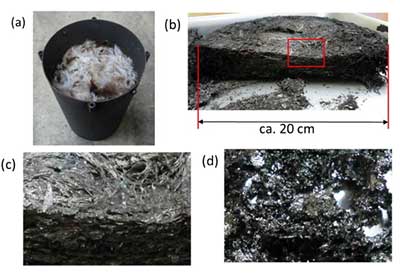 圖1。在800 ℃ 熱處理后得到的原料和方法:a)在不銹鋼反應(yīng)器中引發(fā)羽毛,b)由羽毛和酚醛樹脂以1:1的質(zhì)量比(F1Ph1) c)羽毛活性炭。
