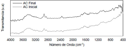 在圖1示出了從由有機材料獲得的活性炭的表面的顯微照片在呈現過程中產生的產物,用這證實了結構和這種材料的典型孔隙率。從活性炭的紅外光譜(圖2)獲得的結果與振動譜帶一致。在光譜中,觀察到四個感興趣的帶。一個位于3200和3600cm-1之間,與羥基和羧酸的振動相關,另一個位于2700和3000cm-1之間,與羧基和羰基相關(1000-1200cm-1)和最后1550和1680cm-1與醌相關聯。
